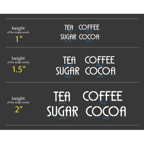 This set comes with 4 different stencils: TEA, COFFEE, SUGAR and COCOA