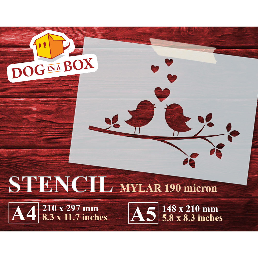 Reusable love birds stencil for painting on wood, walls or fabrics.