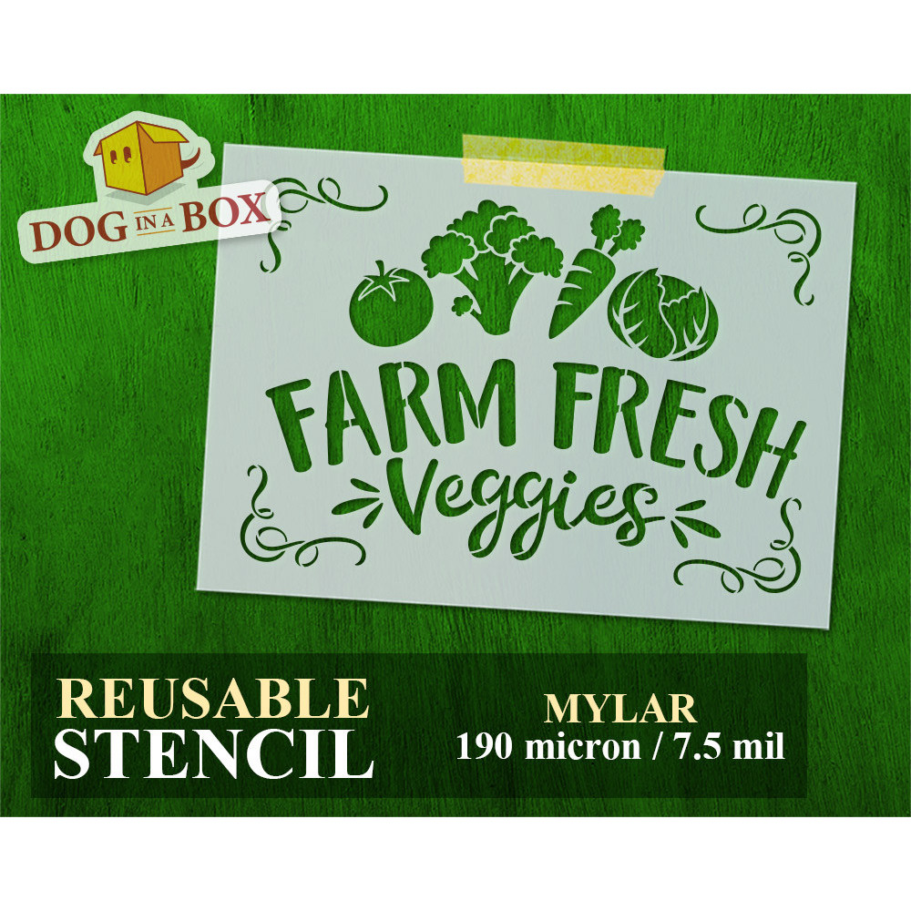 Il s'agit d'un pochoir avec "Farm Fresh Veggies".