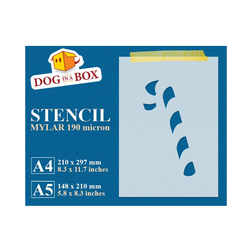 Vous achetez un pochoir polyvalent très détaillé, fait de Mylar 190 microns sans danger pour les aliments (approuvé par la FDA) avec un film de polyester résistant aux solvants.