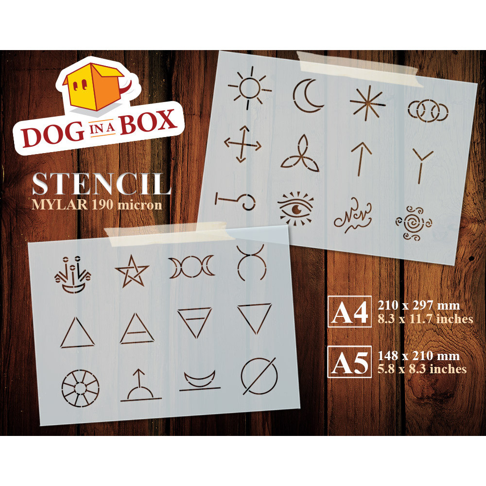 Pochoirs Wiccan Runes (Ensemble de 2 feuilles) - Pochoirs réutilisables Wiccan pour murs, bois et tissus.
