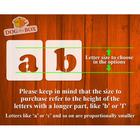 Vous pouvez facilement choisir la taille de la lettre, gardez à l'esprit que les dimensions se réfèrent à la hauteur des lettres . Veuillez garder à l'esprit que les dimensions se réfèrent à la hauteur des lettres avec une partie plus longue (comme «b» ou «f» - les lettres comme «a» ou «c» sont proportionnellement plus petites).