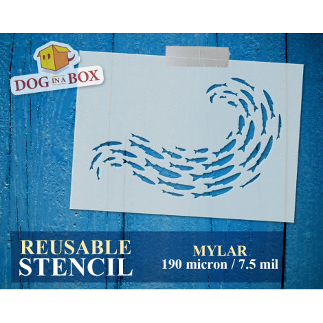Stencil riutilizzabile di sciame di pesci per la pittura su legno, pareti o tessuti.