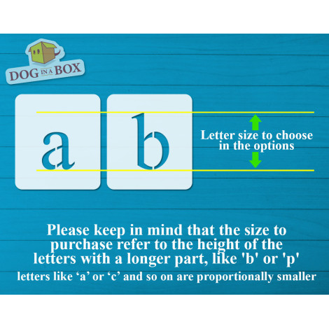 Puoi facilmente scegliere la dimensione della lettera: tieni presente che le dimensioni si riferiscono all'altezza delle lettere con la parte più lunga (come la 'b' o la 'f' - mentre le lettere come 'a' o 'c' sono proporzionalmente più piccole).