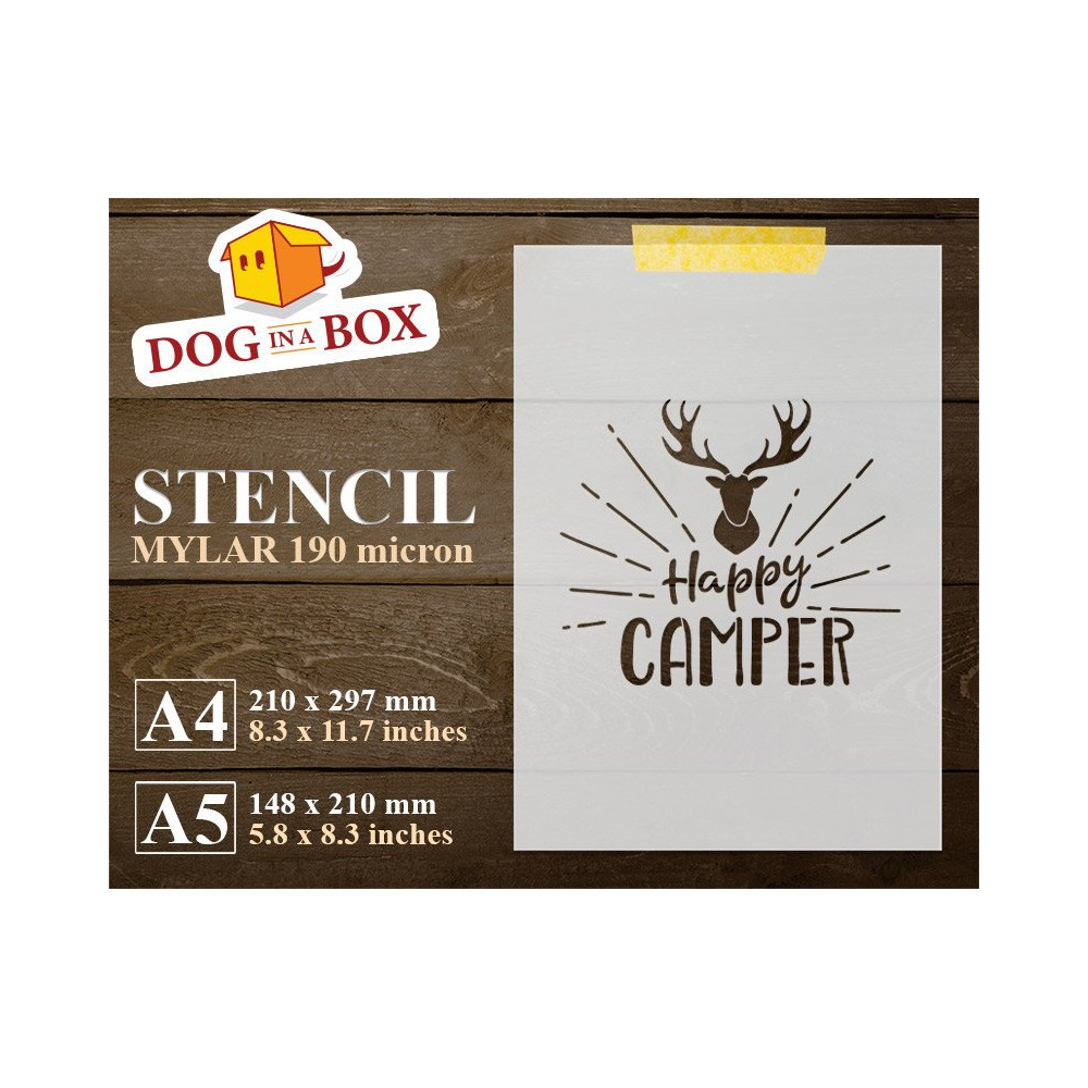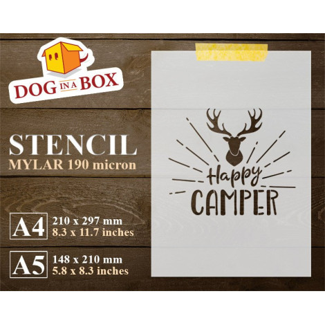 Stencil riutilizzabile "Happy Camper" per la pittura su legno, pareti o tessuti.